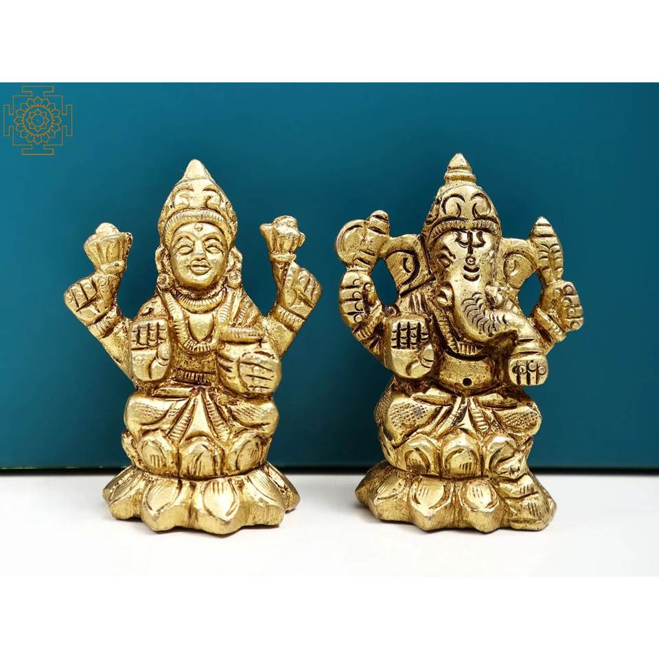 Escultura de latón hecha a mano de 2 pulgadas del Señor Ganesha y la Diosa Lakshmi con pequeña talla elegante hecha en la India