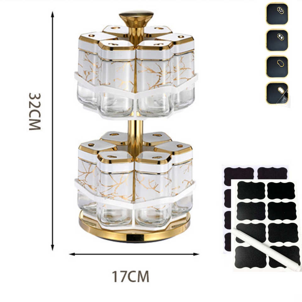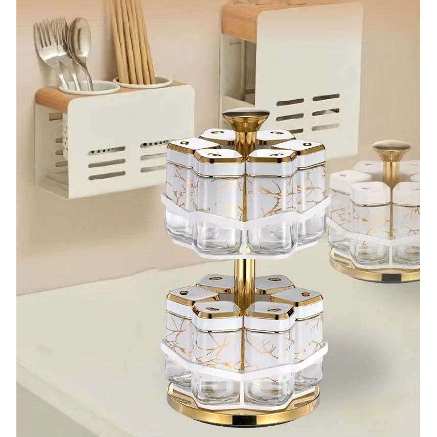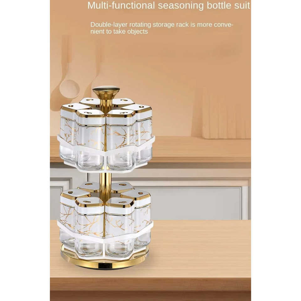 Estante Giratorio de Metal de 2 Niveles para Especias y Condimentos de Cocina, con 12 Frascos de Vidrio, Organizador Conveniente para Almacenamiento en el Hogar