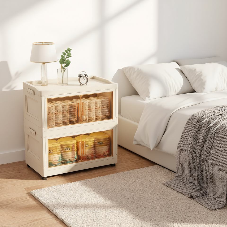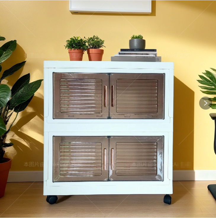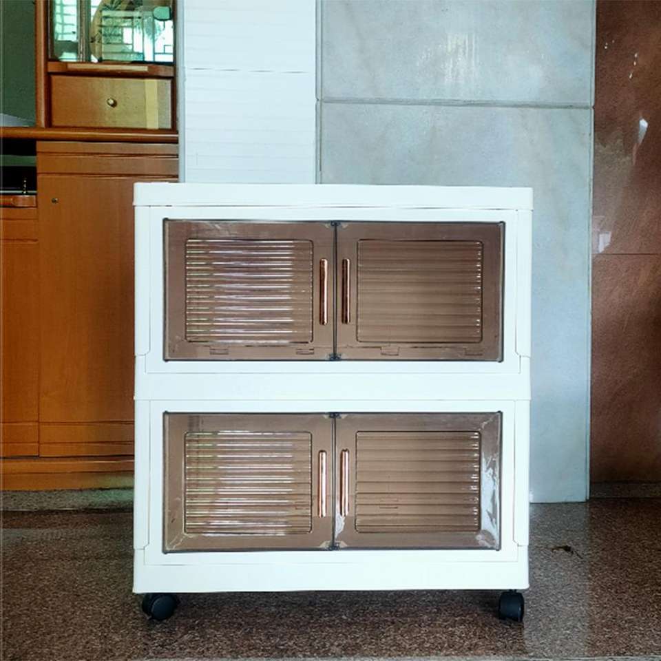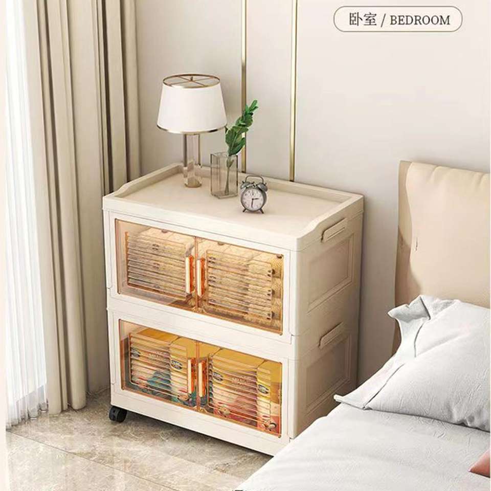 Puerta abierta lateral de 2 capas apilable hogar transparente ropa de gran capacidad juguetes caja de plástico plegable con ruedas