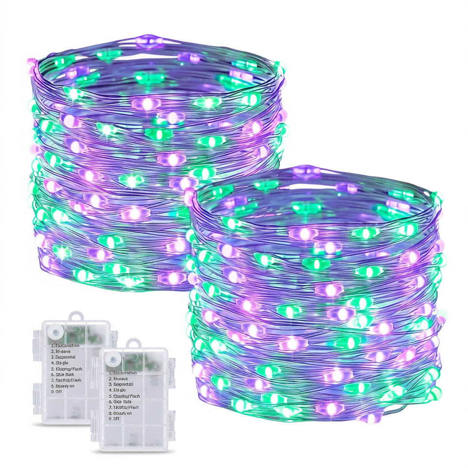 Paquete de 2 Guirnaldas de Luces LED de 10 m (33 pies) con 100 Luces, Funcionan con Pilas, Color Morado y Verde, 8 Modos, Control Remoto, Decoración para Porche y Chimenea