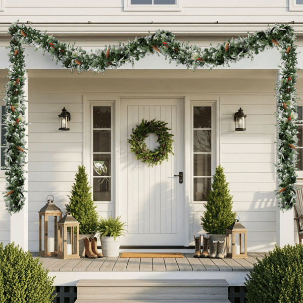 Paquete de 2 Guirnaldas Navideñas Preiluminadas de 2.7 Metros con Nieve Artificial, 200 Luces Cálidas, 440 Puntas, Bayas Rojas, Corona y Guirnaldas Navideñas Artificiales