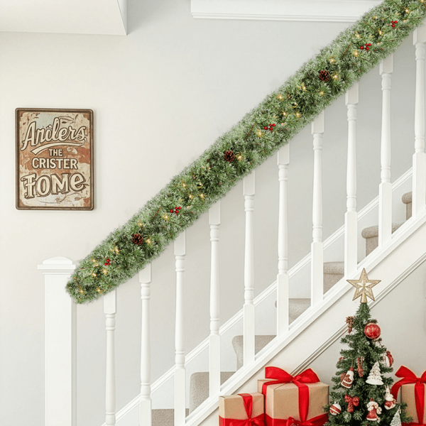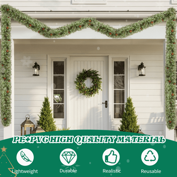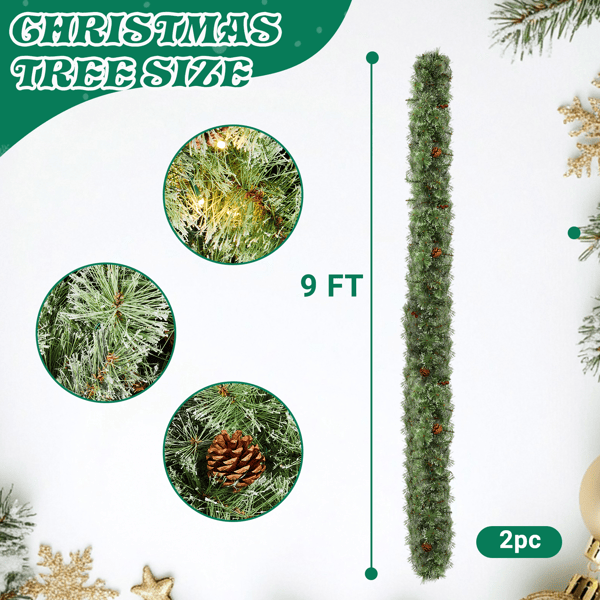 Paquete de 2 Guirnaldas Navideñas Preiluminadas de 2.7 Metros con Nieve Artificial, 200 Luces Cálidas, 440 Puntas, Bayas Rojas, Corona y Guirnaldas Navideñas Artificiales