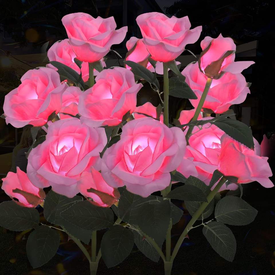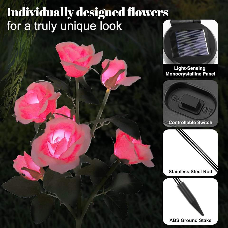 Paquete de 2 Luces LED Solares para Exteriores con Forma de Rosa, 14 Flores, Resistentes al Agua, con Cambio de Color, Alimentadas por el Sol