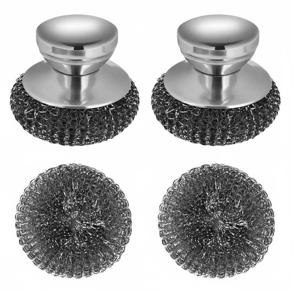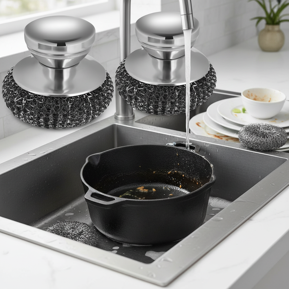 Juego de 2 estropajos de lana de acero inoxidable con mango de acero para limpiar platos, ollas de hierro fundido - Esponjas y estropajos