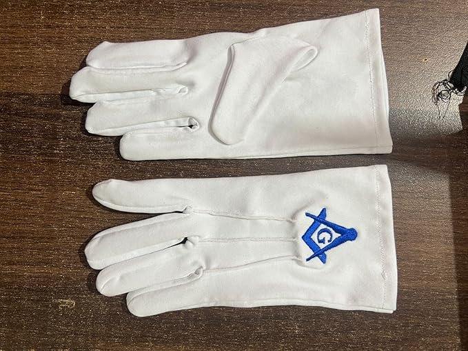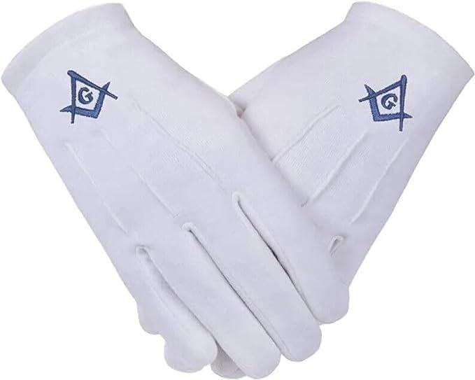 (2 pares) Guantes masónicos bordados a máquina con diseño de cuadrado y brújula azules, 100% algodón, talla única para todos