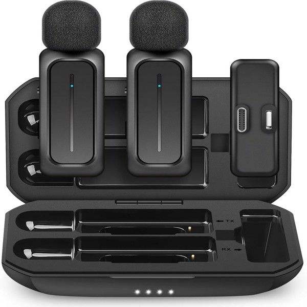 2 Micrófonos Lavalier Inalámbricos para iPhone, iPad y Android con Estuche de Carga, 7 Horas de Duración, Clip para Solapa, Accesorio para Grabación de Video