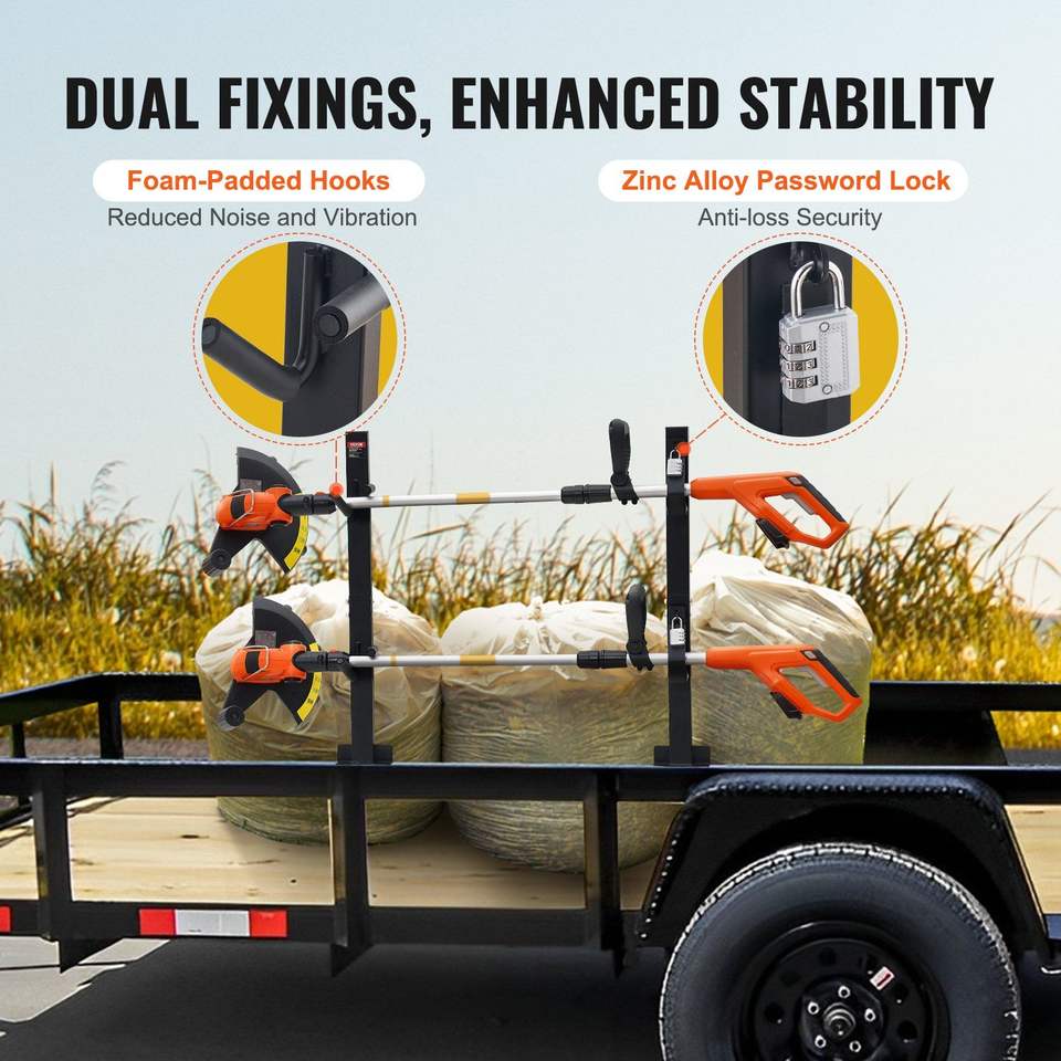 Soporte de 2 posiciones para desbrozadora y recortadora, con cerradura de contraseña de aleación de zinc, para paisajismo, soporte para herramientas de jardín, bandeja para recortadoras, soporte para remolque