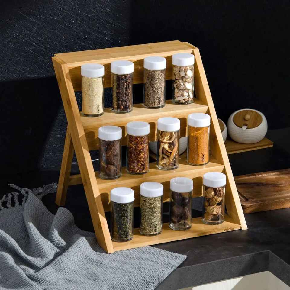 Estante de Especias de Bambú de 2 Niveles, Organizador de Condimentos de Cocina Montado en la Pared con Frascos de Vidrio, Estante de Almacenamiento Ecológico para Frascos