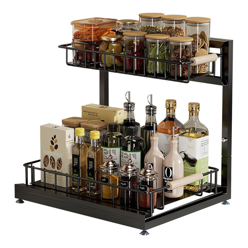 Despensa de 2 niveles, doble deslizamiento, acero inoxidable 304, madera antioxidante, debajo del gabinete, cesta de alambre, organizador de almacenamiento extraíble, cajón extraíble