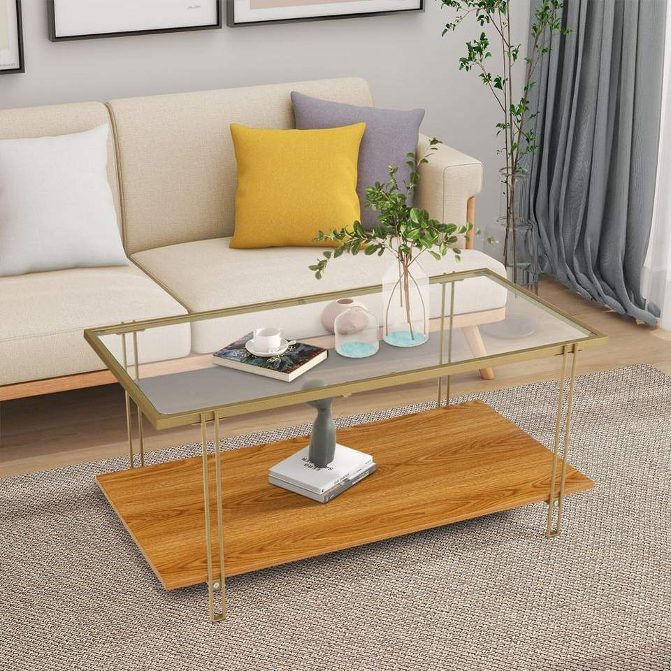 Mesa de Centro Rectangular de Vidrio de 2 Niveles con Estructura de Acero Blanco y Dorado para Sala de Estar