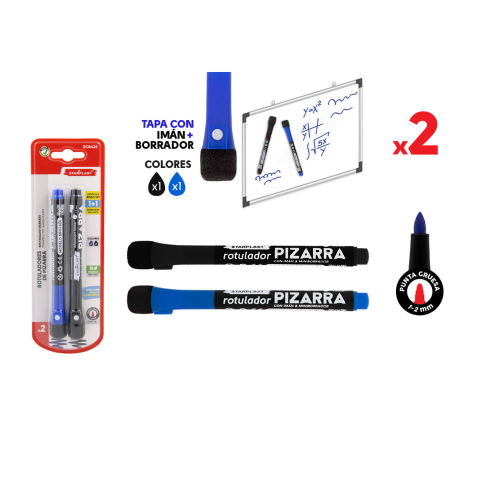 Paquete de 2 unidades de rotuladores de pizarra negra y azul con imán y Borrador de plástico con certificación EN71 para uso escolar