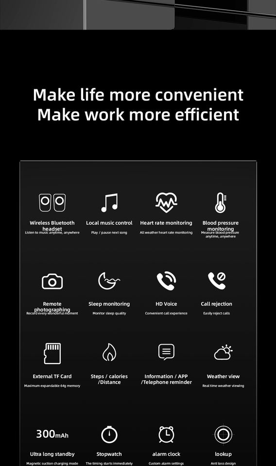 Función:Cronógrafo, Reloj despertador, Control remoto, Rastreador de sueño, seguimiento de forma, Recordatorio de llamada, Respuesta telefónica, Mensaje emergente, Recordatorio de mensajes, Marcar llamada, Monitor de ritmo cardíaco, 24 horas de instrucción, Sangre monitor de oxígeno