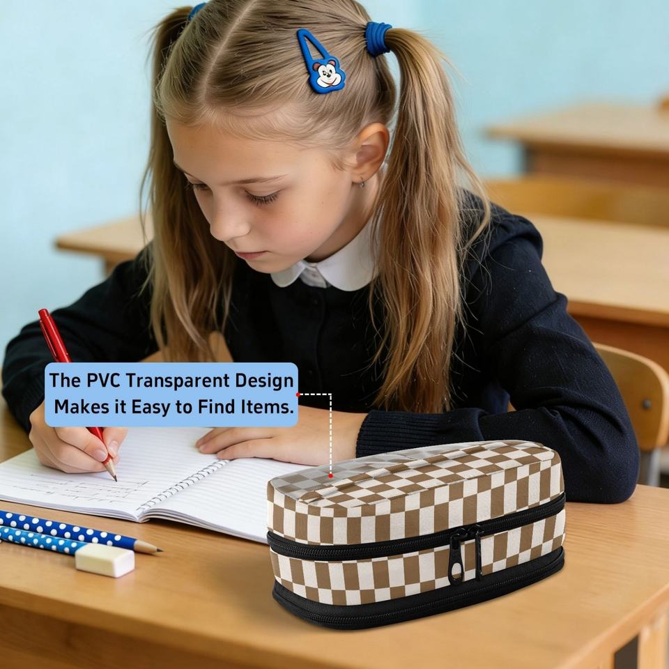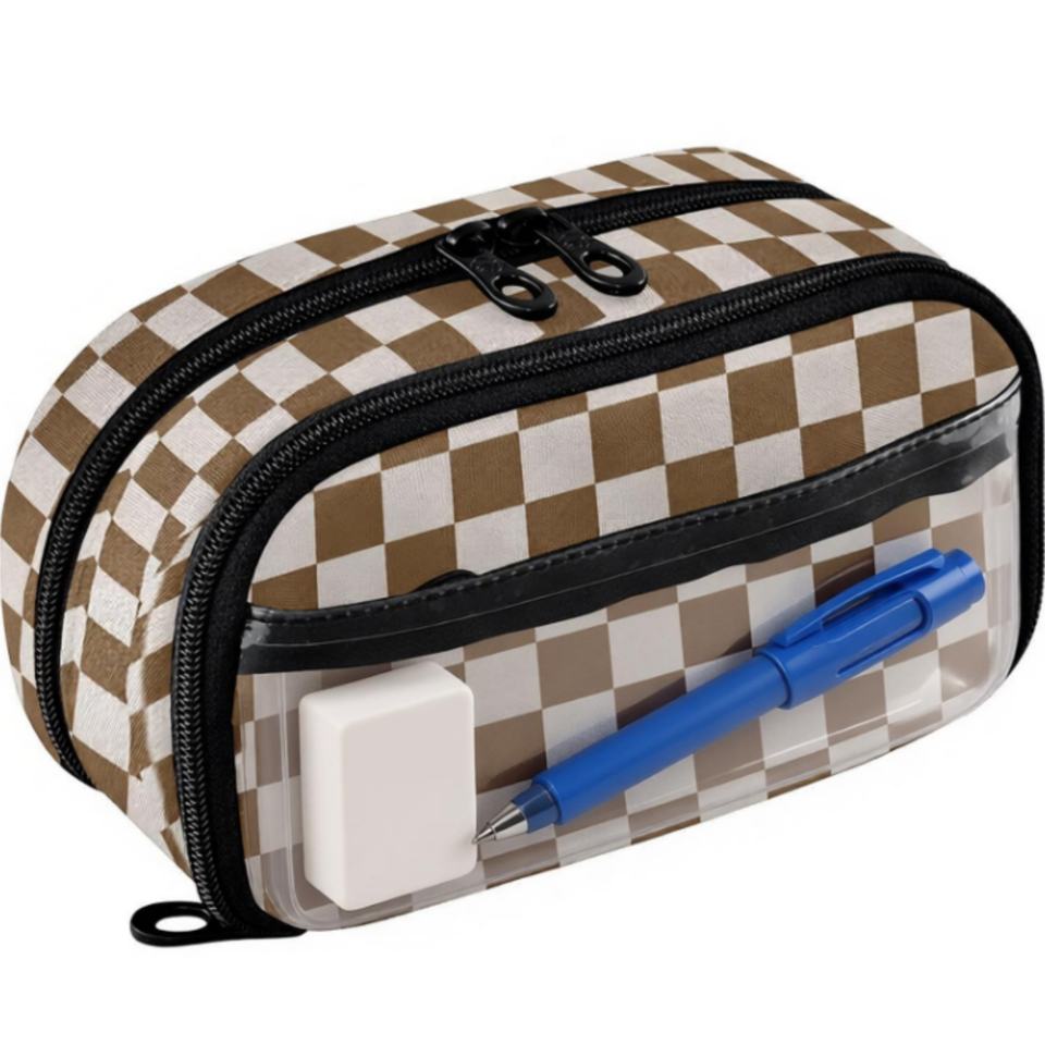 Estuche Escolar para Lápices con Cierre de Cremallera de 2 Capas, Diseño a Cuadros Marrón, Impresión Personalizada, Estuche Resistente de PVC para Estudiantes