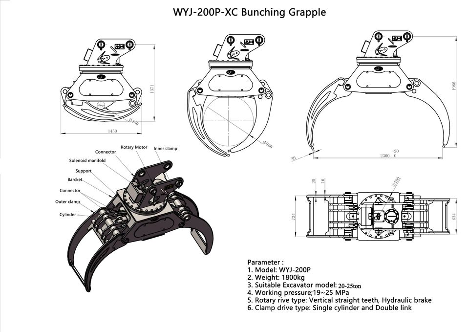 Nombre del producto:Pinza para excavadora WYJ200P para excavadoras de 20 a 25 toneladas, pinza para troncos