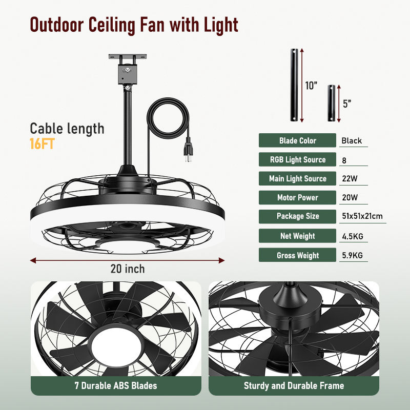 Ventilador de Techo LED para Exteriores de 20 Pulgadas, Resistente a la Intemperie IP65, con Luz, Control por Aplicación, 3CCT Regulable, para Patio, Porche, Pérgola, Gazebo, Toldo