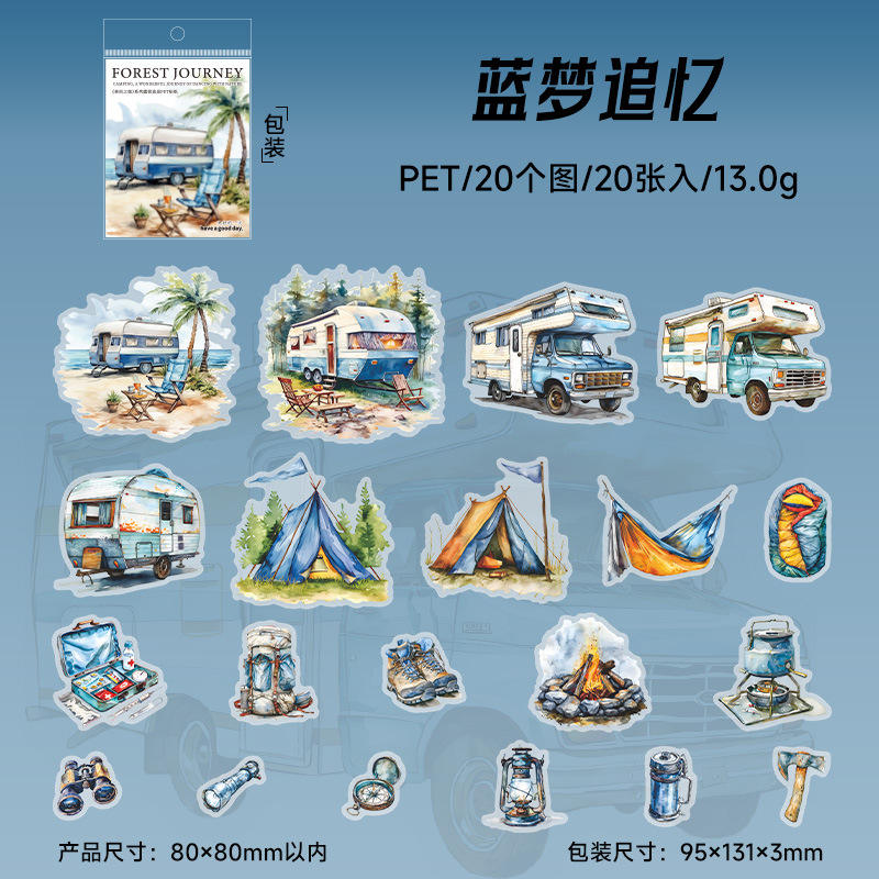 20 hojas/paquete de pegatinas para mascotas con paisaje de camping, serie de viajes al bosque, 6 pegatinas de material alienígena seleccionadas
