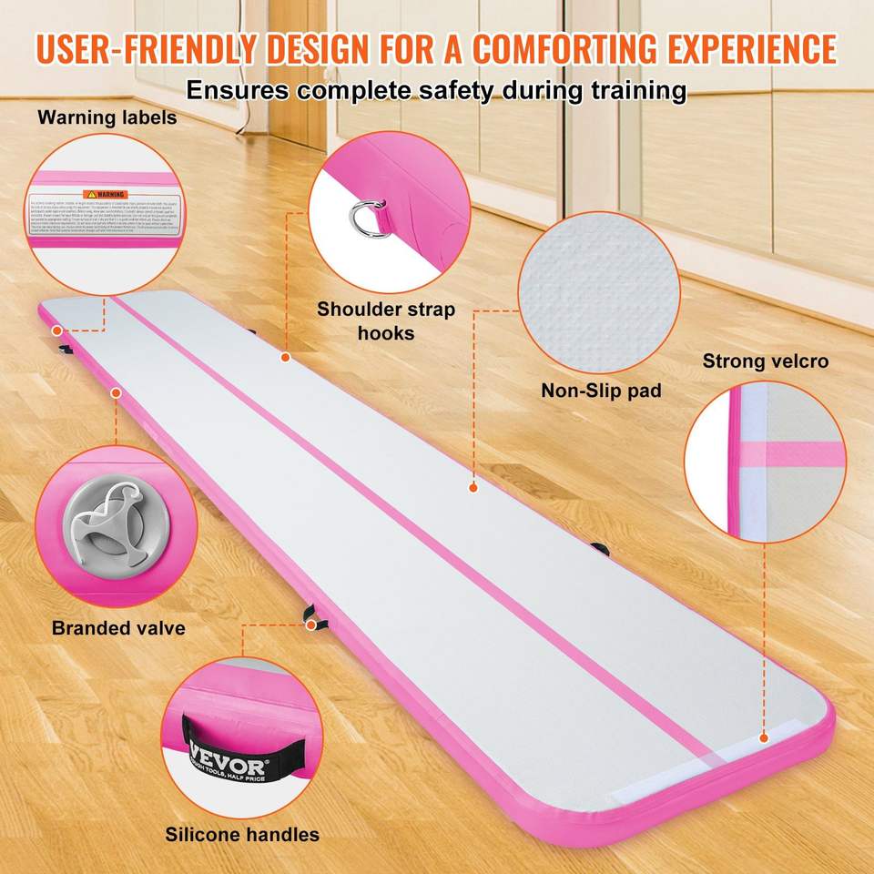 Colchoneta inflable de gimnasia rosa de 20 pies, bomba eléctrica, colchoneta de aire de 4 pulgadas de grosor para gimnasio en casa, entrenamiento acuático, multiusos