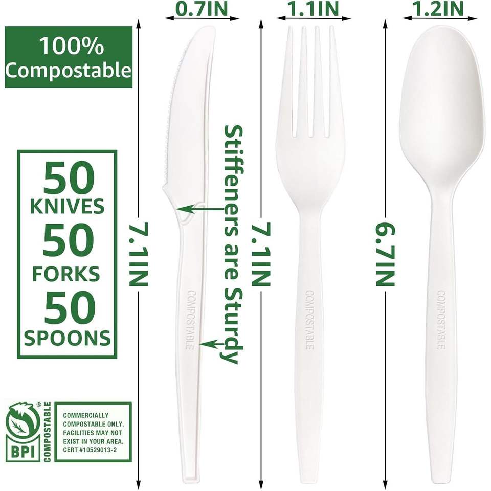 200 Piezas de Cubiertos Desechables Ecológicos 100% Compostables, Cubiertos Resistentes que Incluyen Tenedores y Cucharas, Libres de Plástico, 7 Pulgadas