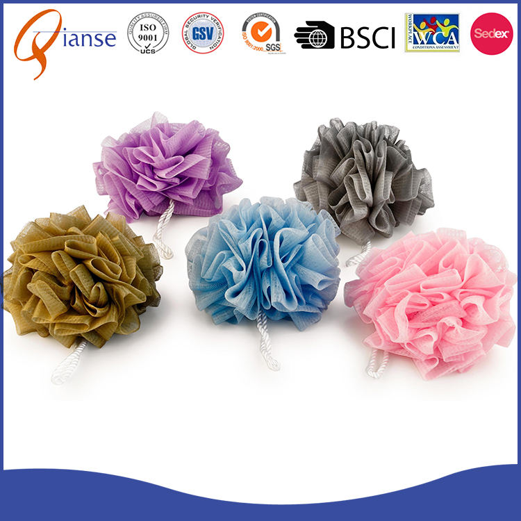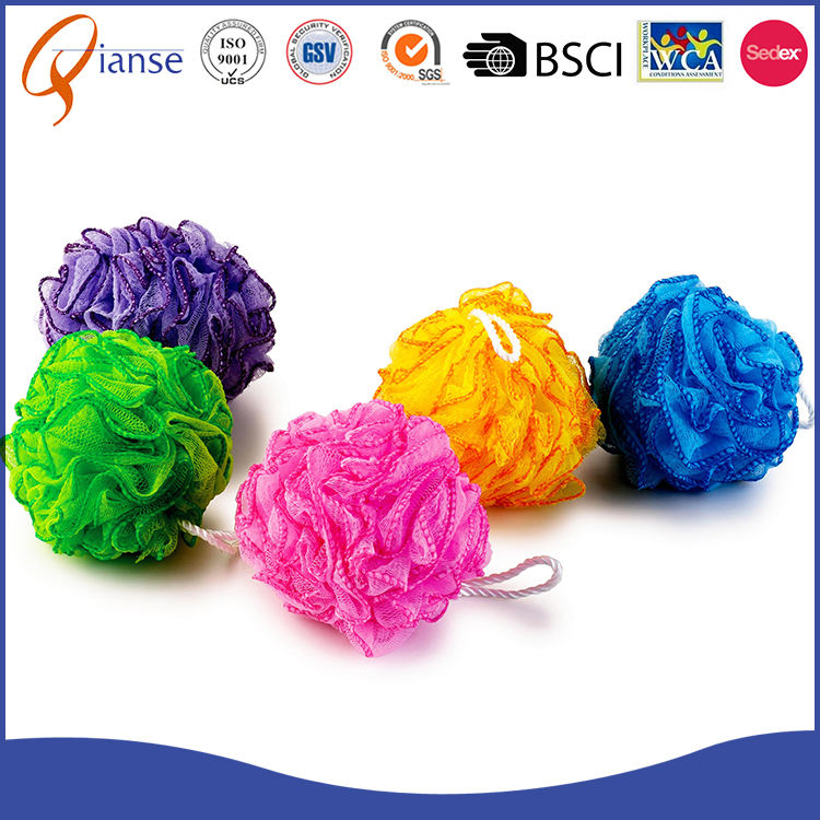 2017 Amazon Proveedor Exfoliante Ducha Puff PE Malla Bolas con Cinta de Raso