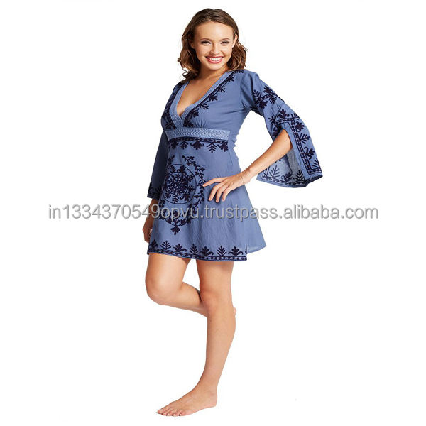 2019 nueva llegada estilo bohemio lana cadena puntada bordado Playa Sol vestido profundo cuello en V largo Sexy de talla grande túnica encaje Natural