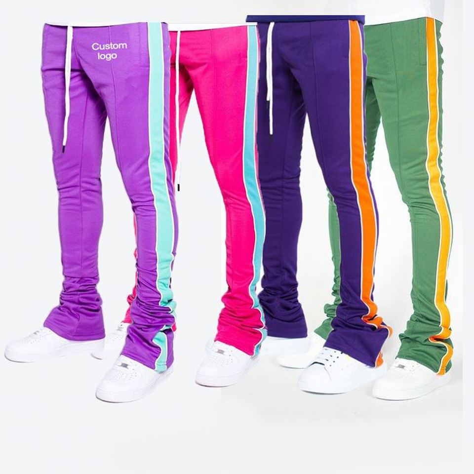 Pantalones apilados con logotipo personalizado para hombre, ropa de calle, pantalones de rayas laterales, pantalón de pista, parte inferior acampanada, venta al por mayor, 2022