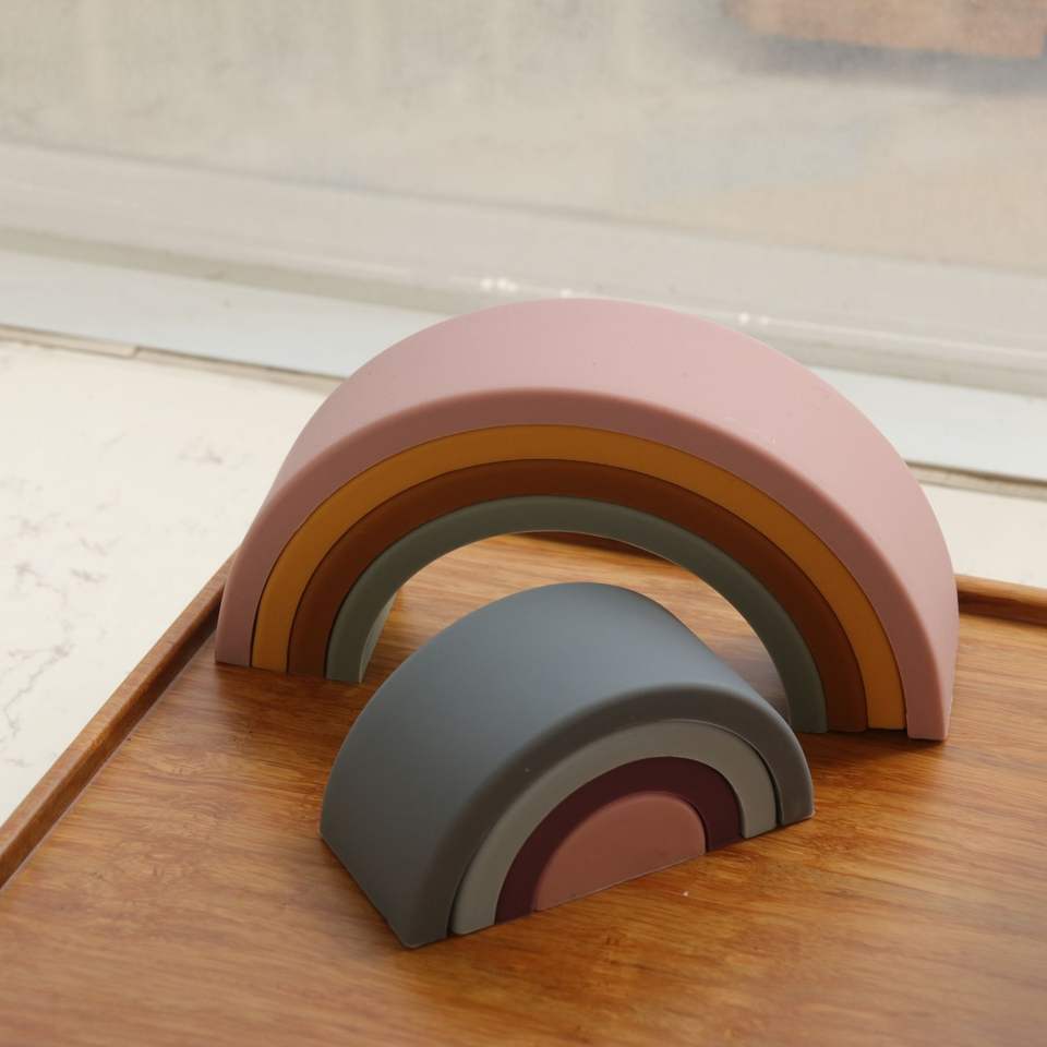 2022 caliente personalizado diseño libre BPA libre bebé silicona Arco Iris mordedor bebé silicona apilable juguete niños Arco Iris molinete juguete