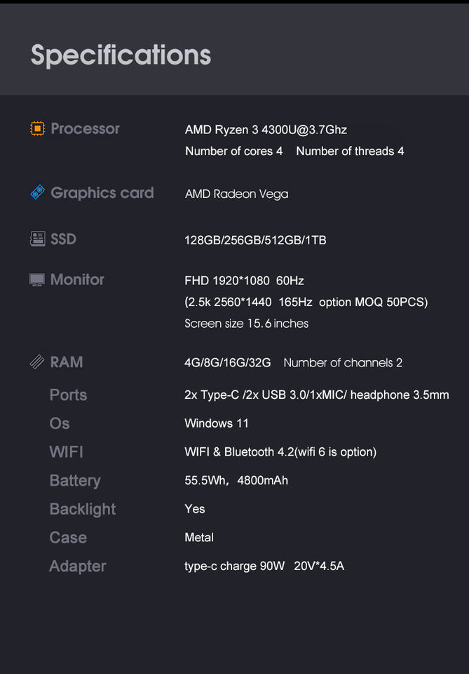 Ordenador portátil de 2022 pulgadas, Laptop Amd Ryzens7 R3 4300U 15,6 Ghz Quad Core tipo-c, con carga de Metal, Wifi 6, por 50 dólares para videojuegos, novedad de 3,7