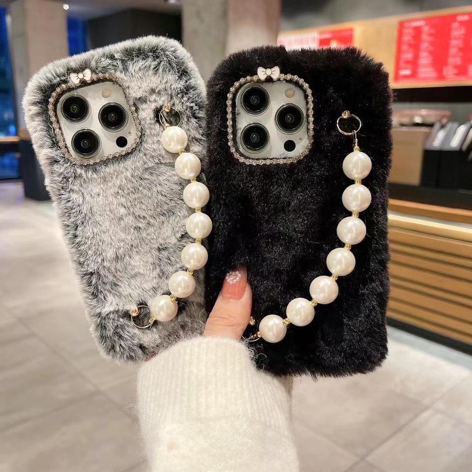 2023 nueva funda de teléfono de felpa Applin de Color sólido de lujo con pulsera de perlas para mujer y niñas para iPhone 12 13 14 15 pro Max