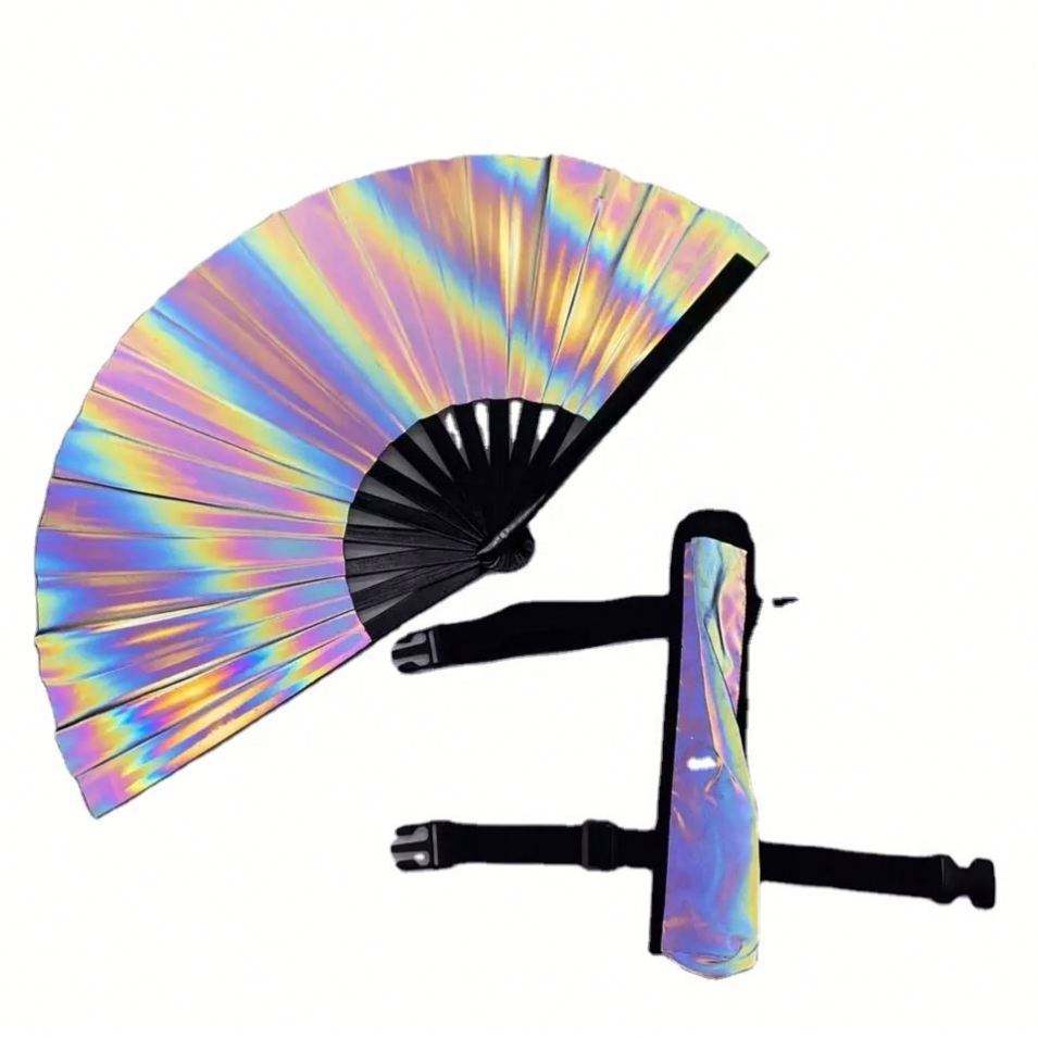 Abanico de Mano Grande Holográfico con Bolsa Iridiscente, Nuevo Estilo 2023