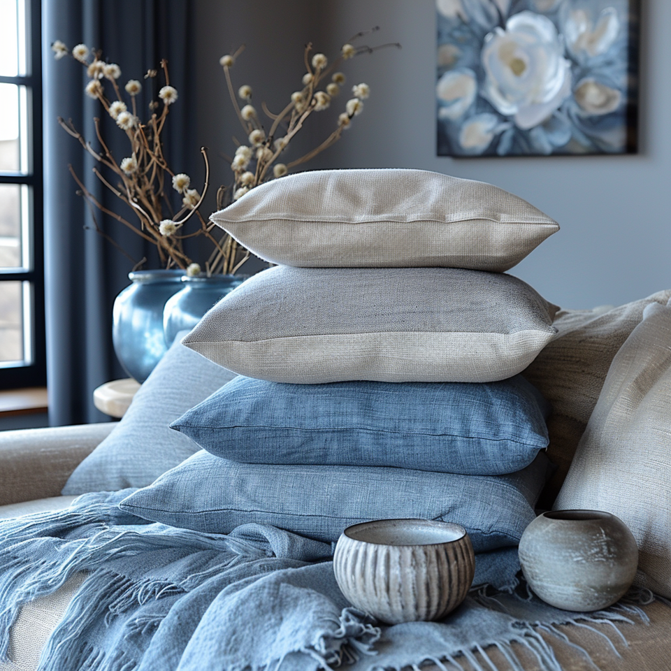 2024 AI concepto creativo Modern Art Deco tonos suaves apagados elegante Esquema de Color índigo y gris para muebles para el hogar sala de estar