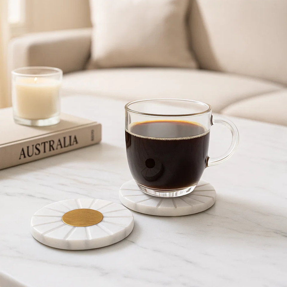 Posavasos de mármol de lujo modernos, diseño de piedra hecho a mano de alta calidad con incrustaciones de latón elegantes para decoración del hogar o alfombrilla para bebidas