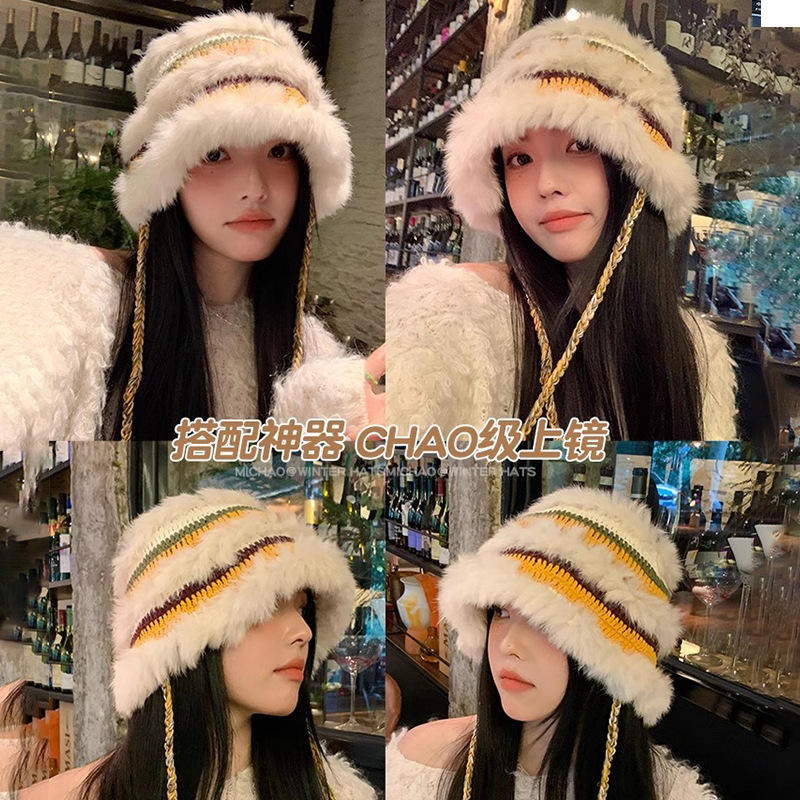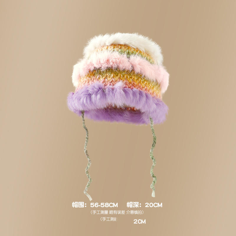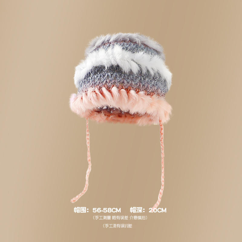 2024 estilo coreano tres colores suave conejo felpa empalme aislamiento invierno sombrero poliéster cálido protección para los oídos sombrero de cubo de punto