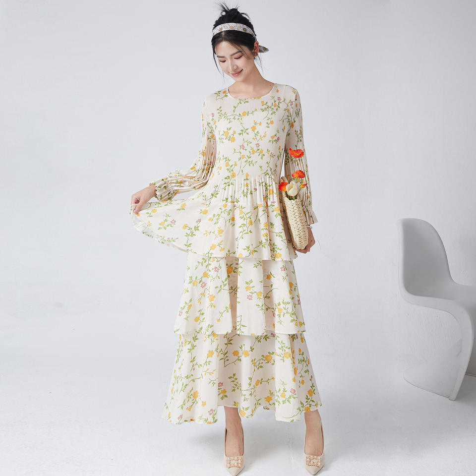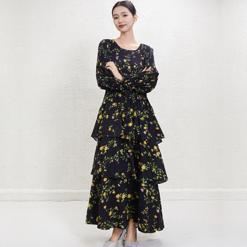 Nuevo Diseño 2024, Vestido Largo Holgado de Otoño, Estilo Vintage, Elegante, de Alta Gama, con Estampado Floral, Fruncido, Natural, Ecológico y Versátil, Estilo Miyake