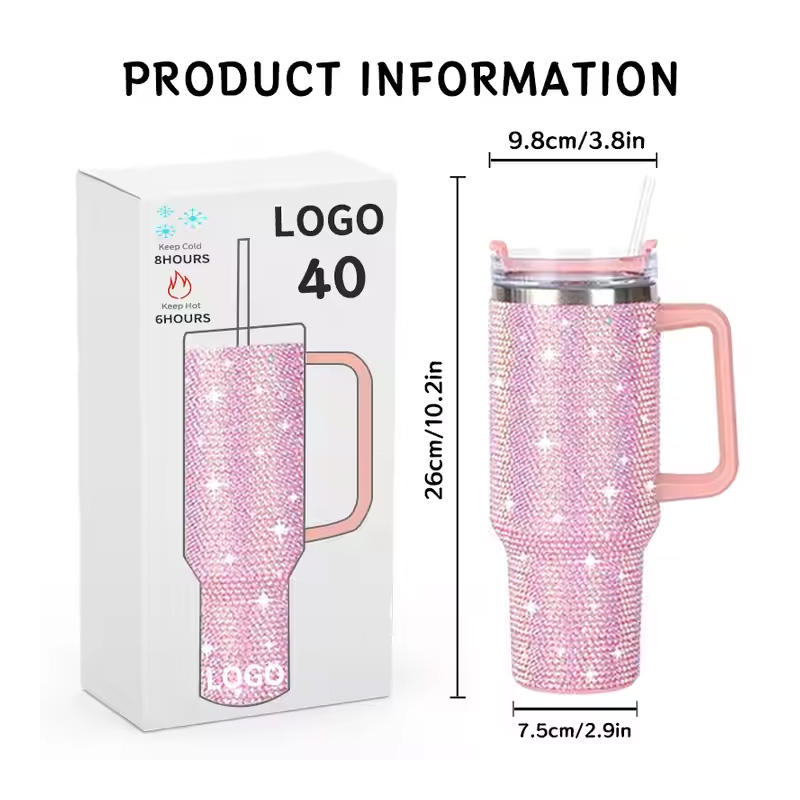 Nuevo Vaso Térmico 2024 con Diseño Brillante de Diamantes de Imitación OEM, 40 oz, Acero Inoxidable, Doble Pared, Aislamiento al Vacío, Antiderrames, con Asa y Tapa