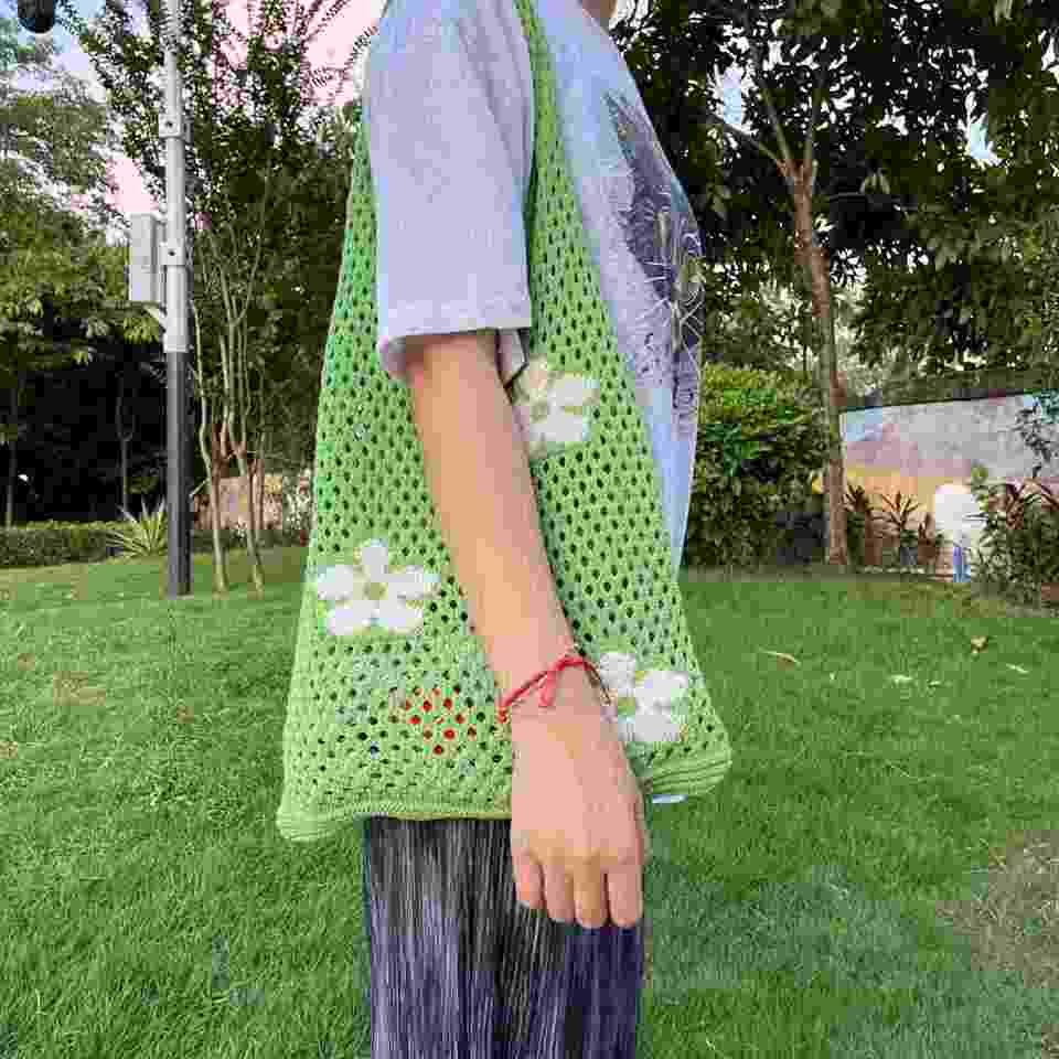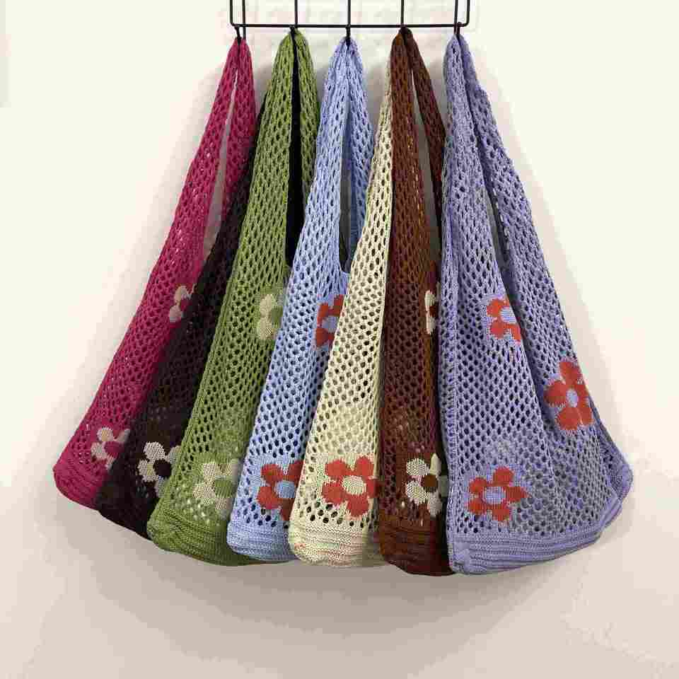 Bolso de mano de ganchillo con patrón floral de primavera 2024, de moda, de malla hueca, estilo rústico, impermeable con cierre de cremallera