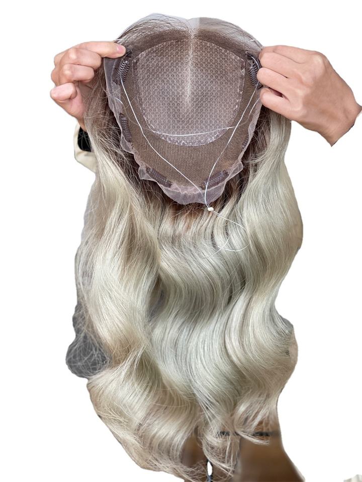 2024 Shy Toppers Mini peluca parte media mujeres cabello humano Topper Clips cuero cabelludo encaje completo Rubio Balayage Ombre pelo europeo Topper