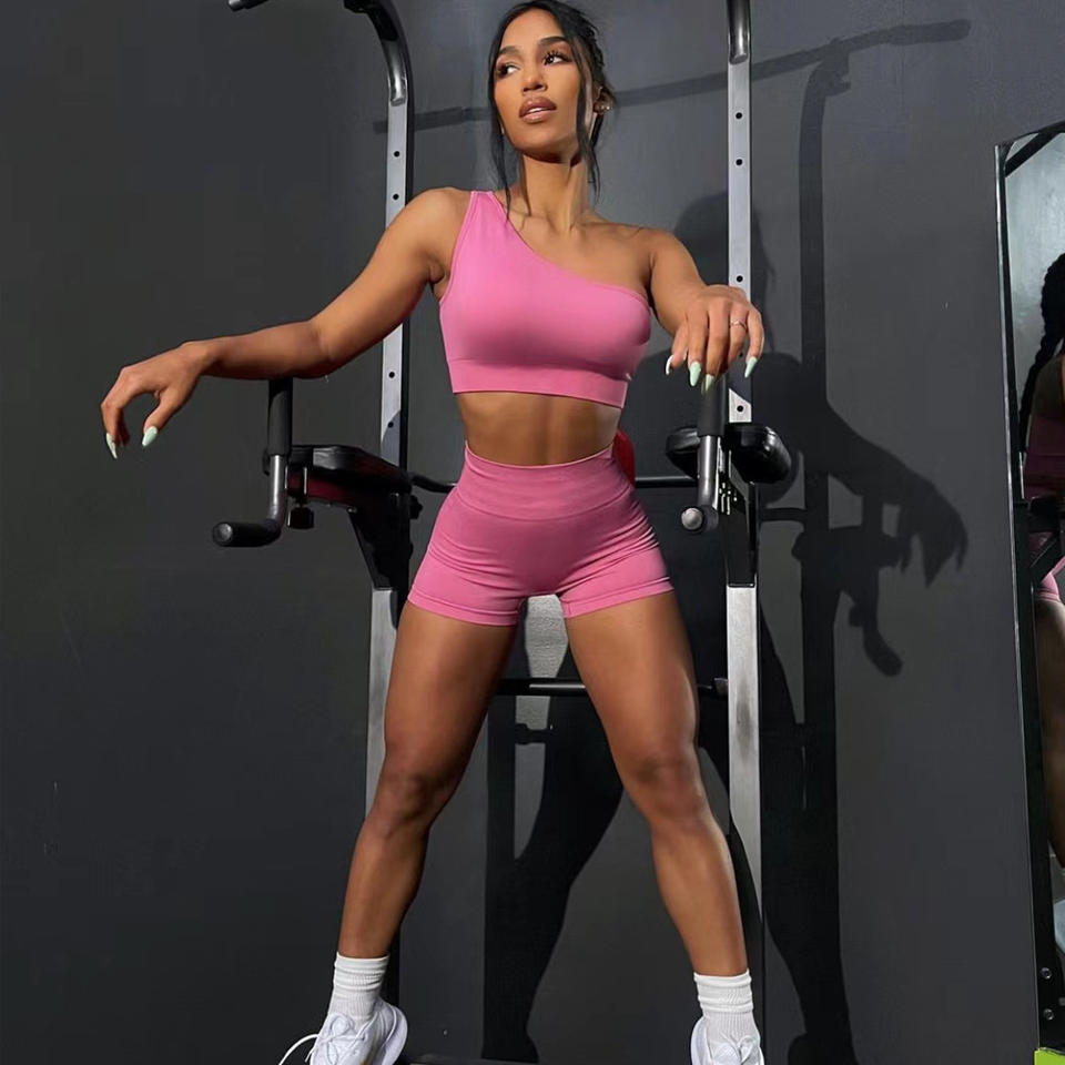 Conjunto de Yoga de un hombro de primavera 2024 para mujer, ropa de Fitness sin costuras de talla grande, en la cintura Logo, gimnasio, Fitness, manga corta, estampado sólido