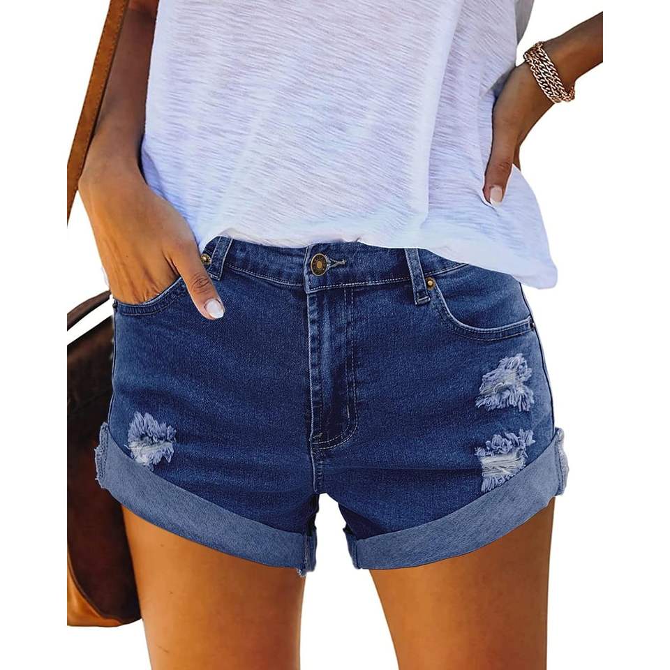 2025 2024 Pantalones cortos vaqueros rectos informales de tiro medio para mujer Pantalones vaqueros elásticos desgastados rasgados Y2K Dobladillo plegable Pantalones calientes