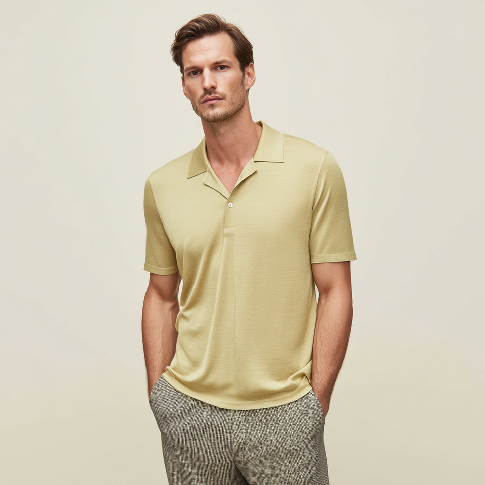 Polo de Lujo para Hombre 2026-2026, Cuello Abierto, Seda y Algodón, Diseño Sólido, Tejido de Punto
