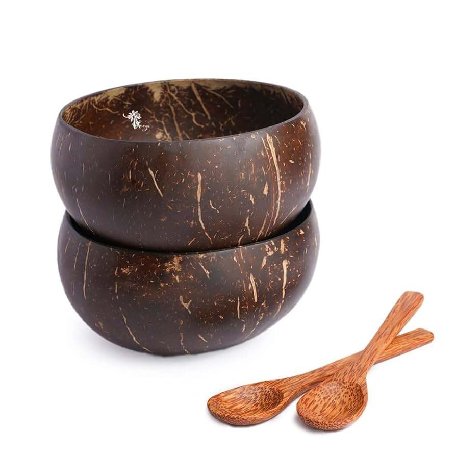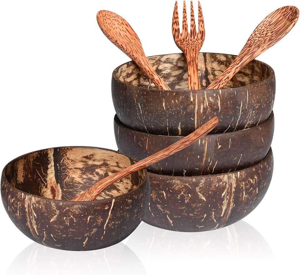 2025 Cuencos de coco de 4 piezas y cucharas de madera Juego de vajilla con caja Estilo chino tradicional 100% ARTESANÍA HF natural