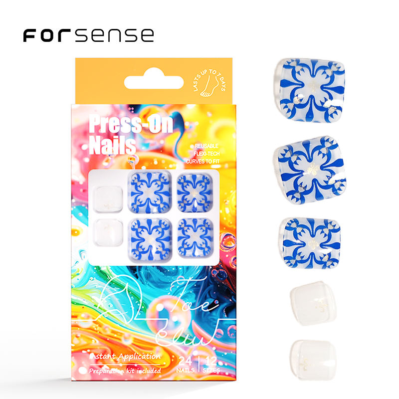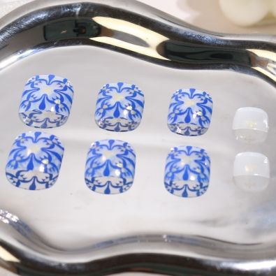 2025 hermosos diseños de flores puntas de uñas de los pies Tema de pintura clásica azul blanco uñas postizas para mujeres elegante claro pies falsos uñas