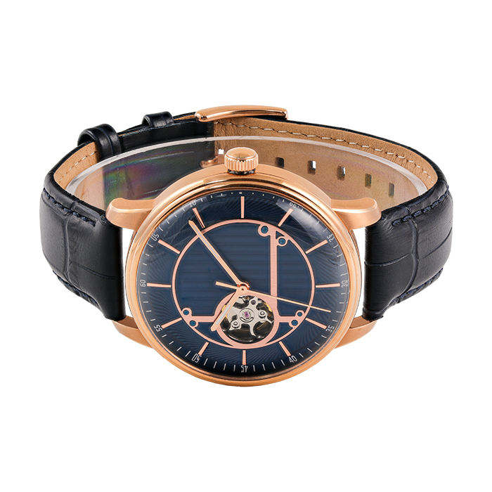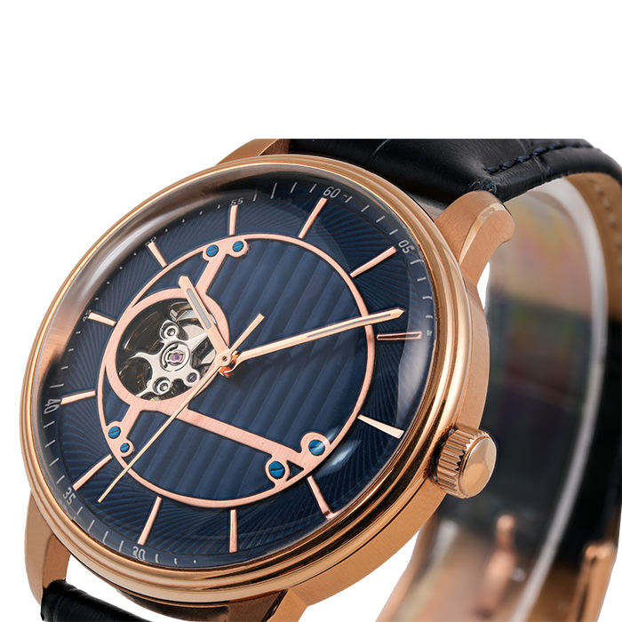 2025 Reloj mecánico más vendido con esfera de esqueleto de oro rosa y correa de cuero para hombres