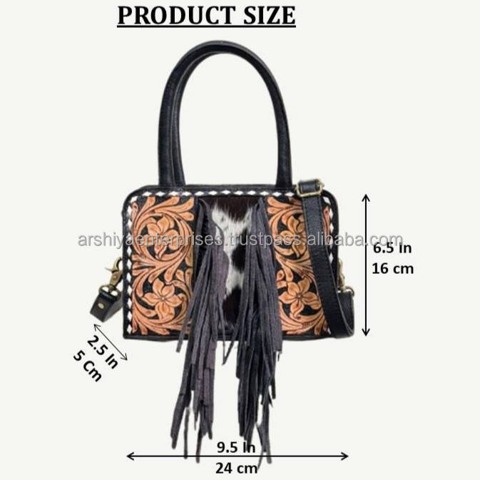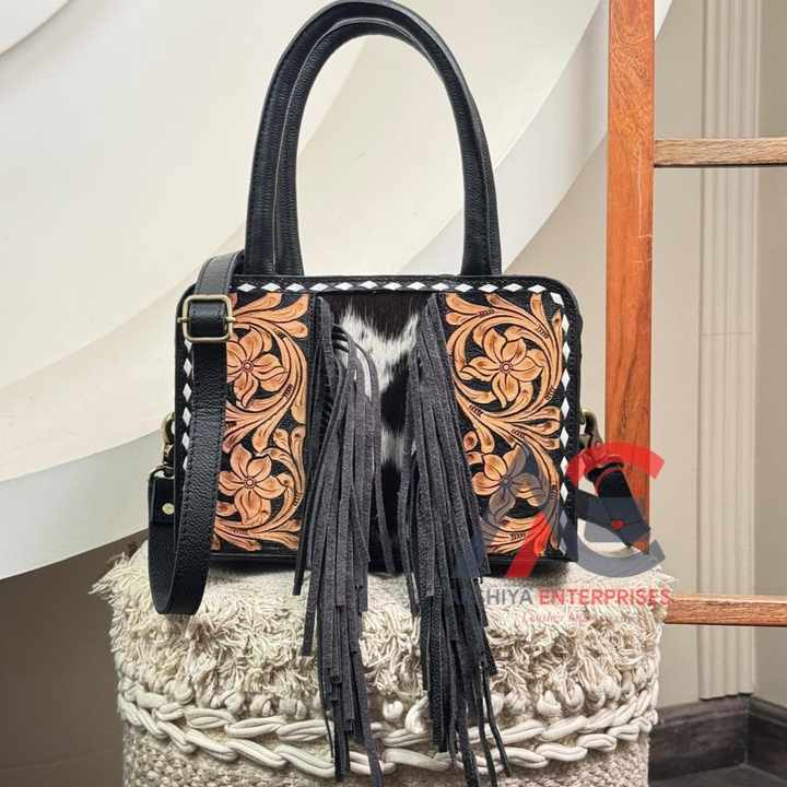 Product Name:Hand Tooled Cowhide Leather Fringe Mini Tote Bag