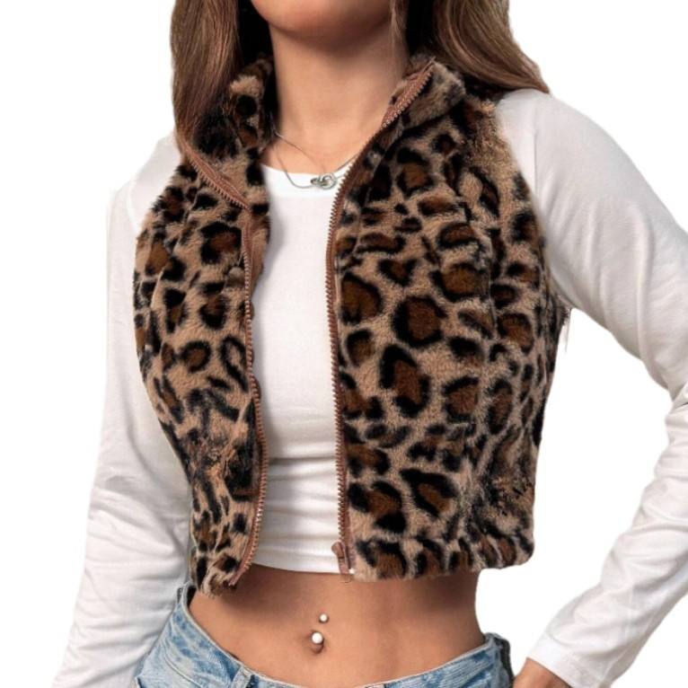 Chaleco de Felpa con Estampado de Leopardo y Cuello Mao Vintage para Mujer, Estilo Holgado con Cierre, Novedad Otoño-Invierno 2025