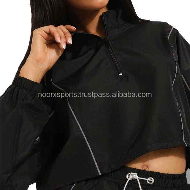 Conjunto corto cortavientos de manga larga negro con carcasa reflectante de nailon de poliéster en blanco personalizado 2025 para mujer