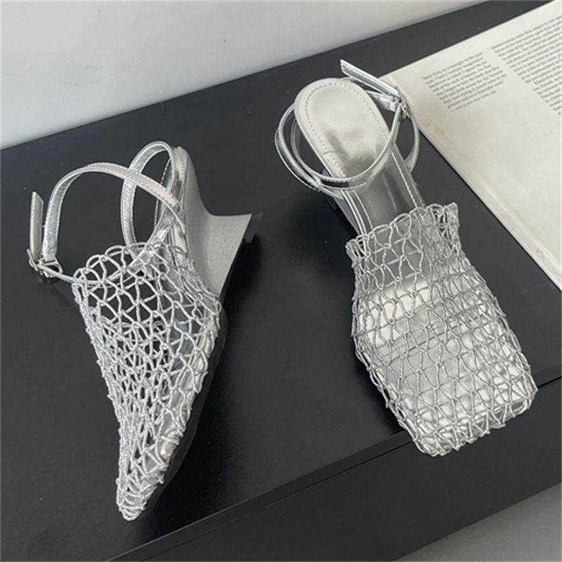 Sandalias de malla hechas a mano personalizadas 2025 para mujer, estilo europeo y americano, nuevos tacones altos huecos para mujer