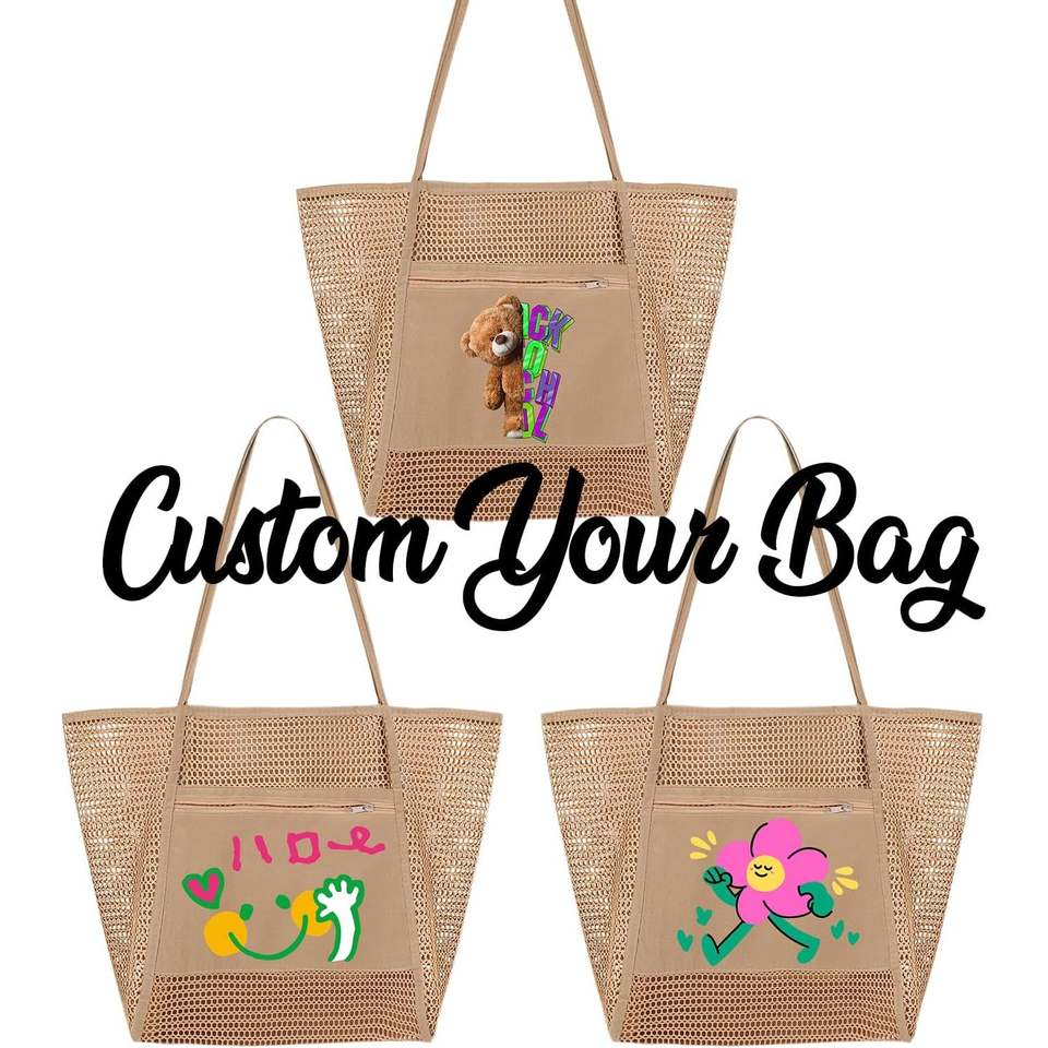 2025 bolso de playa de malla de estilo caqui personalizado para mujer, bolso de hombro con gran capacidad de almacenamiento con opción de complemento de logotipo