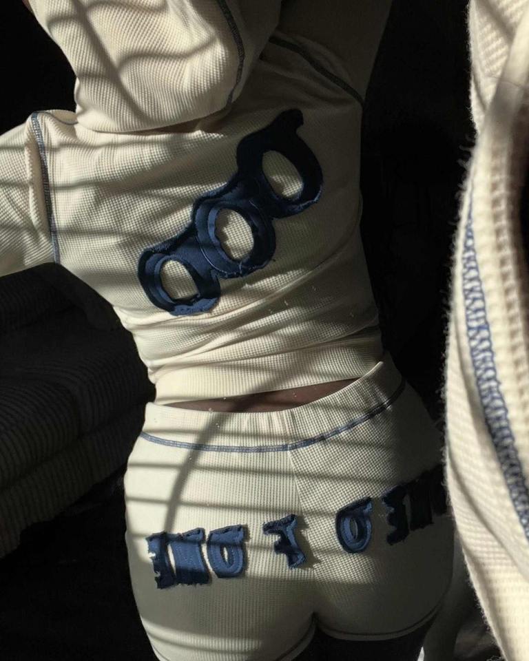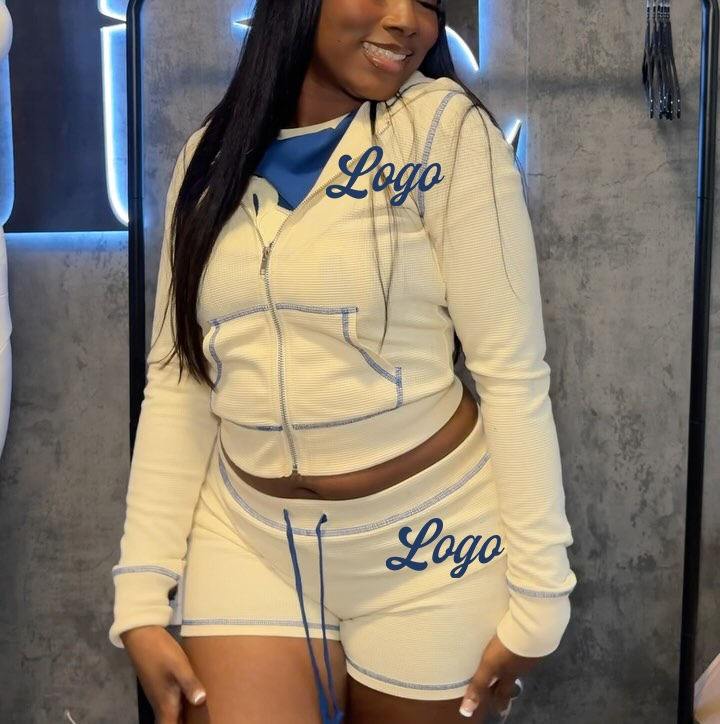 Conjunto de dos piezas de verano con cremallera y logotipo personalizado 2025 para mujer, chaqueta con capucha corta y pantalones cortos, ropa de salón, conjuntos de punto de gofres para mujer