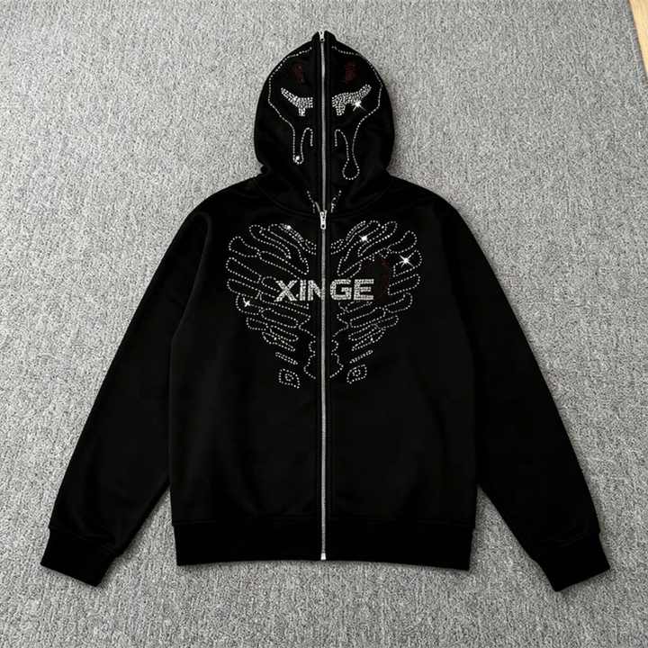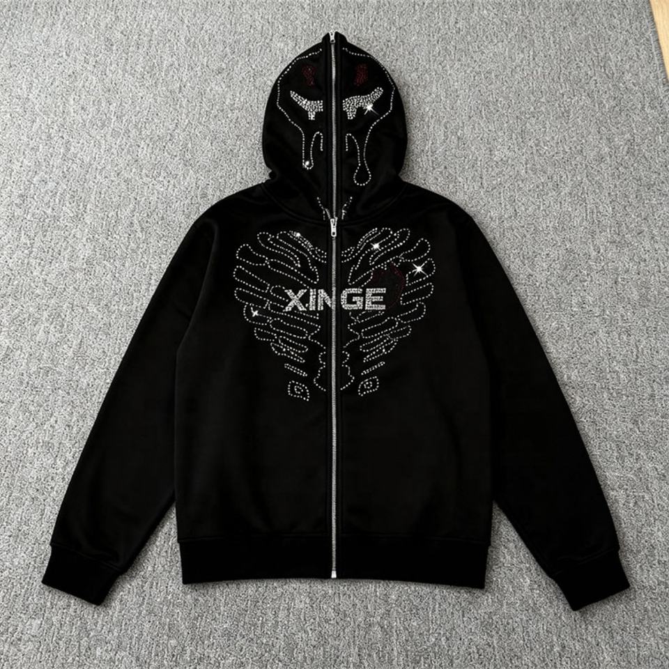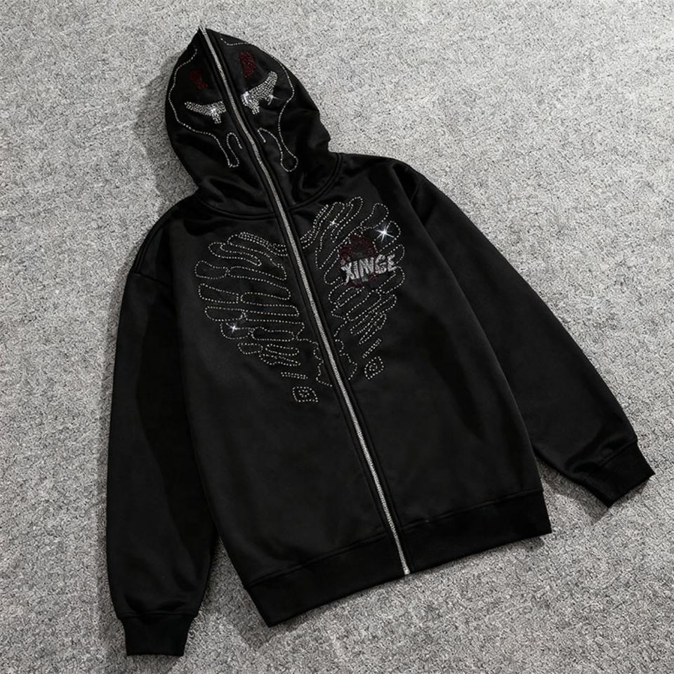 Sudadera con capucha y cremallera completa unisex personalizada 2025 con pedrería, estilo urbano, estampado gráfico de calavera con pedrería, sudadera oversize de corte holgado
