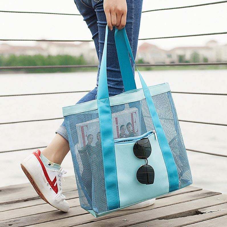Bolsa de Compras de Malla Azul Personalizable de Alta Calidad con Logotipo Impreso Personalizado 2025, Bolsas de Playa de Verano de Malla de Poliéster Negras para Mujer